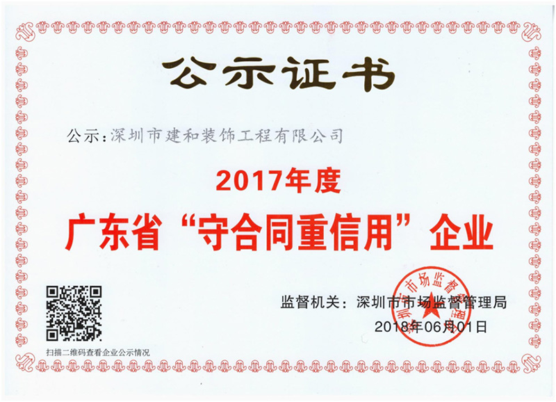 | 近日,建和裝飾榮獲由廣東省工商行政管理局頒發的“廣東省守合同重信用企業”(2017),據了解,“廣東省守合同重信用企業”評選是為了鼓勵企業加強合同和信用管理,促進當地企業信用體系建設,活動在廣東省全面開展以來,得到了社會各界和廣大企業的充分認可,已成為廣東省企業信用體系建設重要組成部分,獲獎企業均為有實力的誠信標桿。 建和裝飾自成立以來,誠信履約,規范管理,守法經營,曾榮獲“企業信用評價AAA級信用企業”“廣東省誠信示范企業”等榮譽,建和裝飾連續多年的堅持和進步,得到了業界的一致認可。隨著市場規模不斷擴大,業務不斷擴張,建和裝飾將繼續規范合同行為,加大合同管理力度,加強信用體系建設,為營造良好的市場環境,促進和諧社會建設做出更大貢獻。 |