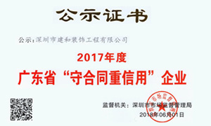 近日,建和裝飾榮獲由廣東省工商行政管理局頒發(fā)的“廣東省守合同重信用企業(yè)”(2017),據(jù)了解,“廣東省守合同重信用企業(yè)”評選是為了鼓勵企業(yè)加強合同和信用管理,促進當?shù)仄髽I(yè)信用體系建設,活動在廣東省全面開展以來,得到了社會各界和廣大企業(yè)的充分認可 ...